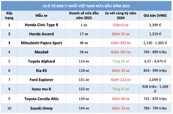 Dưới đây là thông tin chi tiết về 10 ô tô bán ít nhất Việt Nam nửa đầu năm 2025:
