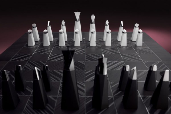 Mỗi quân cờ được chế tác với bề mặt đa diện, trông như những tác phẩm điêu khắc nguyên khối thu nhỏ. Dựa trên hình dáng của các quân cờ truyền thống, các nhà thiết kế đã kéo dài phần thân biến thành những đế vuông. Từng quân cờ đều được làm từ nhôm, phủ gốm, chứa nam châm ẩn và trên đỉnh đầu là thép không gỉ, đánh bóng như một viên ngọc.