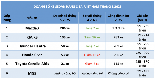 Cộng dồn 5 tháng đã qua của năm 2025, tổng doanh số bán ô tô sedan hạng C tầm giá dưới 900 triệu đồng đạt 2.554 xe, giảm 1.766 xe, tương đương 40,9% so với cùng kỳ năm 2024. Trong đó, lợi thế trong cuộc đua doanh số nghiêng về phía Mazda3 với tổng doanh số cộng dồn đạt 1.071 xe, nhiều hơn KIA K3 (đạt 783 xe). Trong khi, doanh số cộng dồn của Hyundai Elantra, Honda Civic tính đến hết tháng 5.2025 đạt chưa tới 300 xe.