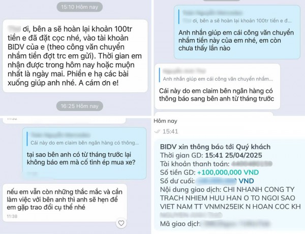 Đến hơn 15 giờ chiều cùng ngày, phía đại lý xác nhận sẽ hoàn lại cho chị T số tiền đã chuyển khoản đặt cọc trước đó. Đáng chú ý, trong tin nhắn gửi đi, nhân viên đại lý có lưu ý rằng "sẽ hoàn lại khoản 100 triệu đồng tiền em đã đặt cọc (theo công văn chuyển nhầm tiền đợt trước em gửi)". Đồng thời kèm theo đề nghị "phiền em hạ các bài (bài viết phản ánh trên mạng xã hội - PV) xuống giúp anh nhé".