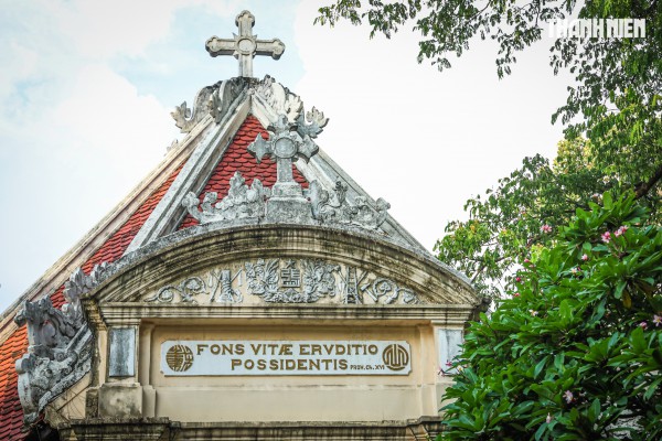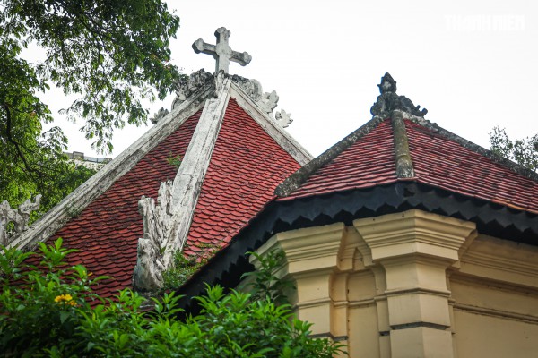 Mái ngói lợp hình vảy cá, màu đỏ cam. Ở mỗi góc mái uốn cong nhẹ, bờ nóc gắn tượng rồng, kỳ lân và hoa văn lá đề theo phong cách trang trí đình chùa truyền thống, tạo nên sự giao thoa văn hóa Đông - Tây kết hợp.