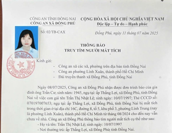 Theo đó, ngày 8.7, Công an xã Đồng Phú tiếp nhận đơn trình báo của gia đình ông Trần Cư (ở xã Đồng Phú) về việc con gái ông là Trần Thị Nhật Lệ bị mất tích trong thời gian ở địa chỉ trên đường số 8, tổ 5, KP.3, P.Linh Trung (nay là P.Linh Xuân), TP.HCM, từ tháng 8.2024 cho đến nay chưa về nhà.