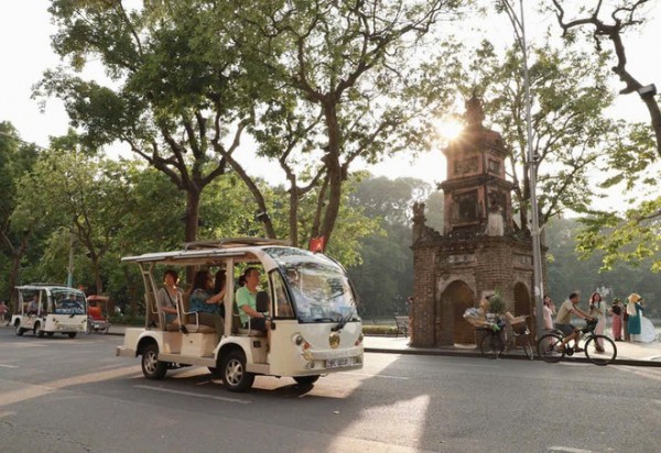 Xe điện đưa du khách tham quan xung quanh hồ Hoàn Kiếm. (Ảnh: Vân Chi/TTXVN)