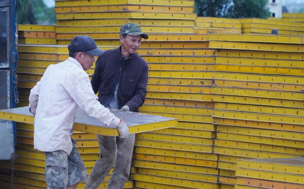 Vận chuyển phương tiện, thiết bị cho lắp đặt khán đài. (Ảnh: S.THÙY)