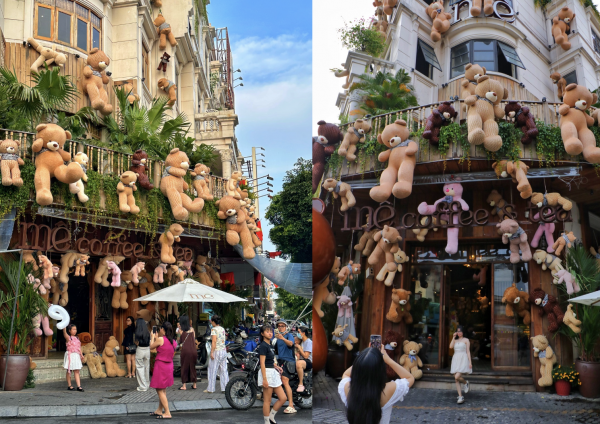 Tiệm cà phê Mê (Q.Gò Vấp) thời gian gần đây thu hút đông khách đến check-in. Nhiều người bày tỏ sự thích thú khi không chỉ không gian bên trong mà ngay cả bên ngoài, những con gấu bông với kích thước lớn cũng được treo lủng lẳng khắp các tầng của quán
