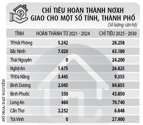 Đây là lần đầu tiên Chính phủ giao chỉ tiêu hoàn thành nhà ở xã hội (NƠXH) cụ thể cho từng địa phương trong mỗi năm. Chẳng hạn, TP.Hà Nội được giao hoàn thành năm 2025 là 4.670 căn hộ; năm 2026 là 5.420 căn… Tổng cộng số lượng căn hộ phải hoàn thành giai đoạn 2025 - 2030 là 44.866 căn. Tương tự, TP.HCM được giao chỉ tiêu hoàn thành trong năm 2025 là 2.874 căn; năm 2026 là 6.410 căn… và tổng cộng phải hoàn thành 66.955 căn hộ từ nay đến 2030. Hay tỉnh Bắc Giang được giao chỉ tiêu đến năm 2030 phải hoàn thành 69.822 căn hộ…