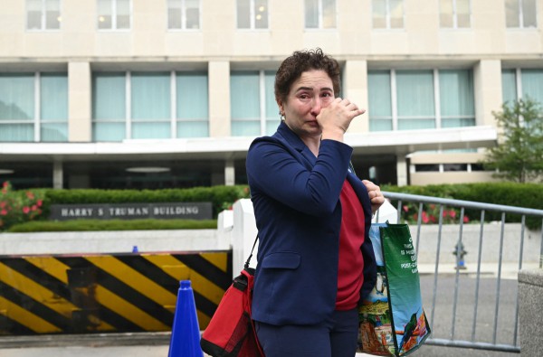 Một cựu nhân viên Bộ Ngoại giao khóc vào thời điểm rời khỏi trụ sở ở Washington D.C Ảnh: AFP