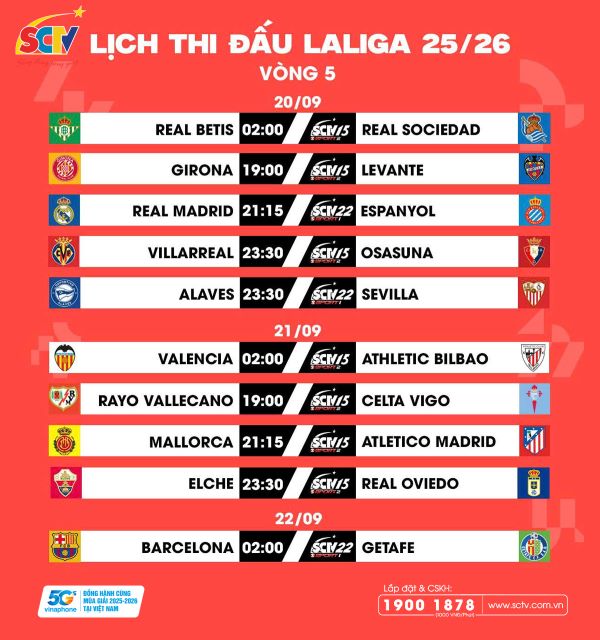 Năm nay, Giải vô địch quốc gia Tây Ban Nha LALIGA EA SPORTS phát trên chuỗi kênh SCTV Thể Thao có sự đồng hành của nhà mạng VinaPhone nhằm mang đến giải đấu chất lượng, siêu sắc nét nhất cho khán giả. Quý khách hàng có nhu cầu đăng ký internet, truyền hình cáp SCTV và tải ứng dụng xem truyền hình trực tuyến SCTVOnline để theo dõi các trận cầu hấp dẫn trên, vui lòng truy cập website: