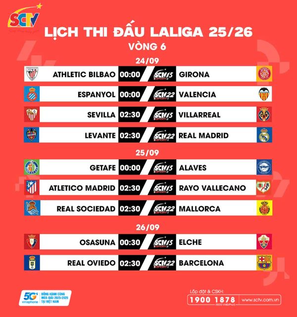 Năm nay, Giải vô địch quốc gia Tây Ban Nha LALIGA EA SPORTS phát trên chuỗi kênh SCTV Thể Thao có sự đồng hành của nhà mạng VinaPhone nhằm mang đến giải đấu chất lượng, siêu sắc nét nhất cho khán giả. Quý khách hàng có nhu cầu đăng ký internet, truyền hình cáp SCTV và tải ứng dụng xem truyền hình trực tuyến SCTVOnline để theo dõi các trận cầu hấp dẫn trên, vui lòng truy cập website: