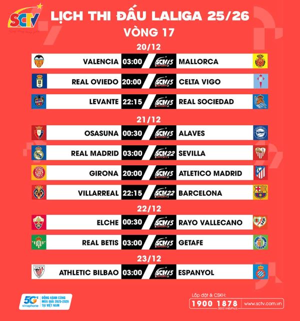 Năm nay, Giải vô địch quốc gia Tây Ban Nha LALIGA EA SPORTS phát trên chuỗi kênh SCTV Thể Thao có sự đồng hành của nhà mạng VinaPhone nhằm mang đến giải đấu chất lượng, siêu sắc nét nhất cho khán giả. Quý khách hàng có nhu cầu đăng ký internet, truyền hình cáp SCTV và tải ứng dụng xem truyền hình trực tuyến SCTVOnline để theo dõi các trận cầu hấp dẫn trên, vui lòng truy cập website: sctv.com.vn hoặc liên hệ tổng đài chăm sóc khách hàng 19001878 để được tư vấn thêm.