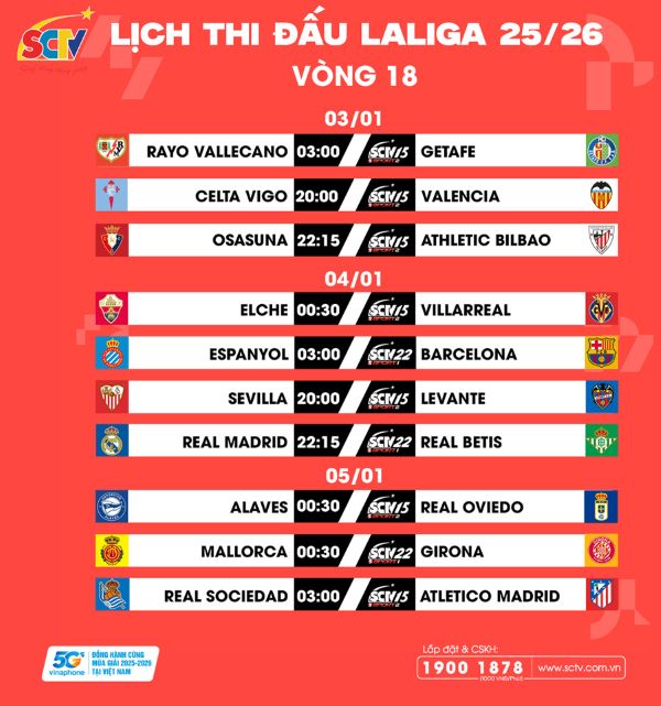 Năm nay, Giải vô địch quốc gia Tây Ban Nha LALIGA EA SPORTS phát trên chuỗi kênh SCTV Thể Thao có sự đồng hành của nhà mạng VinaPhone nhằm mang đến giải đấu chất lượng, siêu sắc nét nhất cho khán giả. Quý khách hàng có nhu cầu đăng ký internet, truyền hình cáp SCTV và tải ứng dụng xem truyền hình trực tuyến SCTVOnline để theo dõi các trận cầu hấp dẫn trên, vui lòng truy cập website: sctv.com.vn hoặc liên hệ tổng đài chăm sóc khách hàng 19001878 để được tư vấn thêm.