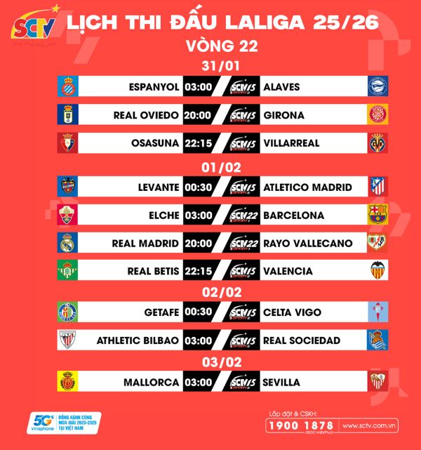 Năm nay, Giải vô địch quốc gia Tây Ban Nha LALIGA EA SPORTS phát trên chuỗi kênh SCTV Thể Thao có sự đồng hành của nhà mạng VinaPhone nhằm mang đến giải đấu chất lượng, siêu sắc nét nhất cho khán giả. Quý khách hàng có nhu cầu đăng ký internet, truyền hình cáp SCTV và tải ứng dụng xem truyền hình trực tuyến SCTVOnline để theo dõi các trận cầu hấp dẫn trên, vui lòng truy cập website: sctv.com.vn hoặc liên hệ tổng đài chăm sóc khách hàng 19001878 để được tư vấn thêm.