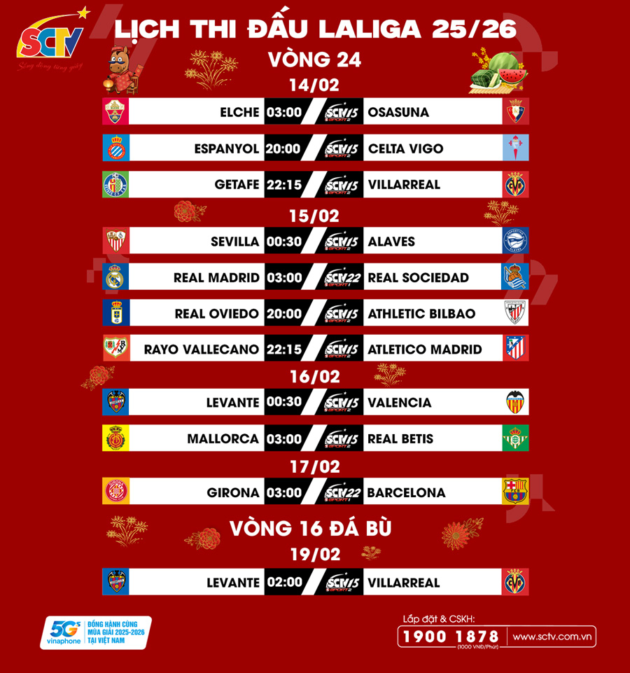 Năm nay, Giải vô địch quốc gia Tây Ban Nha LALIGA EA SPORTS phát trên chuỗi kênh SCTV Thể Thao có sự đồng hành của nhà mạng VinaPhone nhằm mang đến giải đấu chất lượng, siêu sắc nét nhất cho khán giả. Quý khách hàng có nhu cầu đăng ký internet, truyền hình cáp SCTV và tải ứng dụng xem truyền hình trực tuyến SCTVOnline để theo dõi các trận cầu hấp dẫn trên, vui lòng truy cập website: sctv.com.vn hoặc liên hệ tổng đài chăm sóc khách hàng 19001878 để được tư vấn thêm.