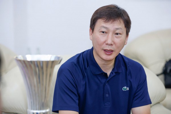 HLV Kim Sang-sik trả lời phỏng vấn Báo Thanh Niên ẢNH: TUẤN MINH