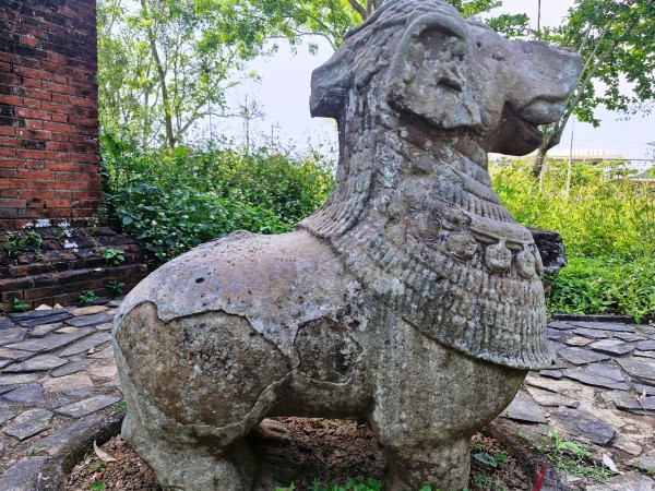 Tượng sư tử bằng đá sa thạch, 1 trong 2 vị thần hộ pháp bảo vệ tháp Chăm cổ Bằng An ẢNH: MẠNH CƯỜNG